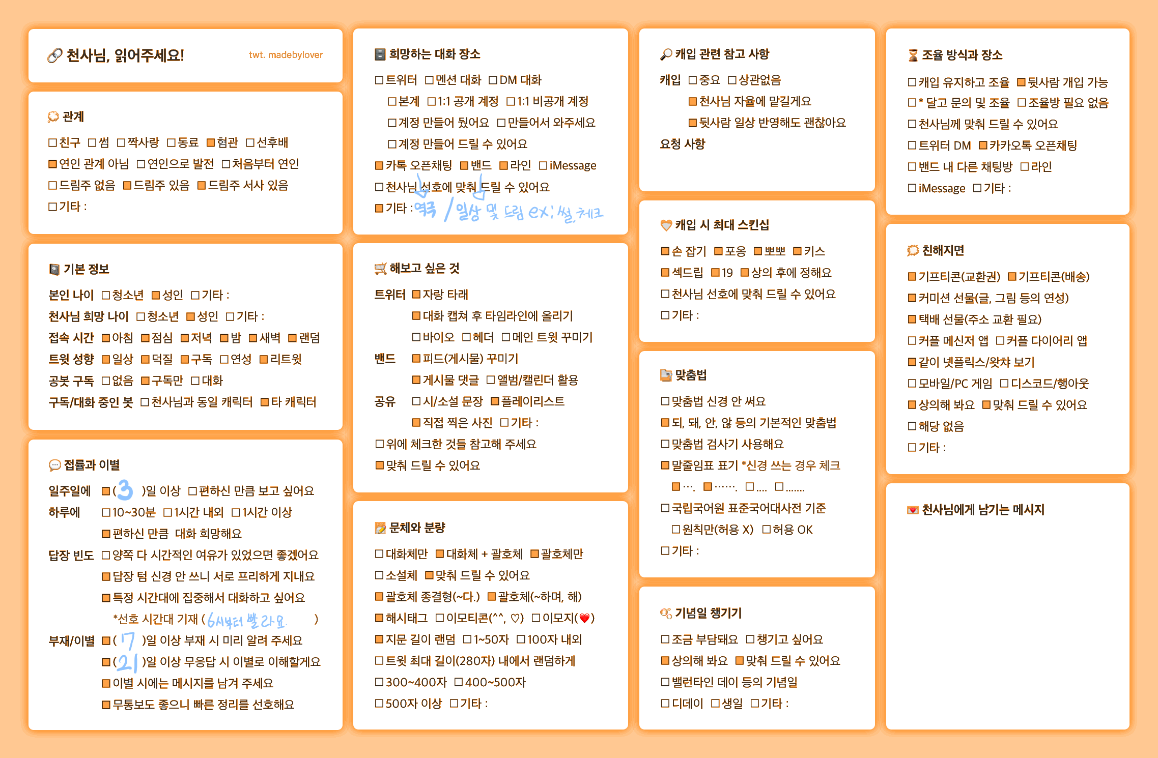 ▪︎접률은 중요하게 보진 않지만은 초반에는 자주 대화했으면 합니다. 맞춰나가봐요! 연락에 대해 집착하거나 하진 않습니다. 천사님의 현생을 존중합니다!
